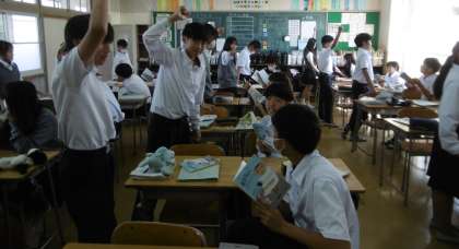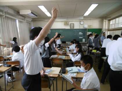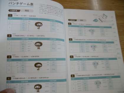 教科書に載っている「パンチゲーム表」を使って、左右の腕の上げ下げによって、I am、You are、He is、She is、They areなどの定型文を言い換えるゲームを行っていました。相手の腕の動きを見て、瞬時に答えていました。