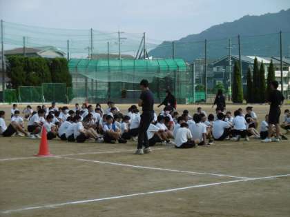 最後の学年種目「四五輪ピック(全員リレー)」の練習をしていました。入場から退場まで、きびきびとした行動ができていました。全体練習後は、各クラスごとに分かれて、作戦会議とクラス練習が行われていました。
