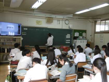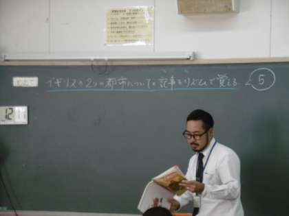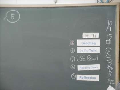「イギリスの2つの都市の記事について、リズムで覚える」が授業のめあてでした。授業の流れも示され、終わるごとに赤のチョークで印を入れていました。そうすることで、生徒にとっては「授業の現在地」がつかみやすくなります。