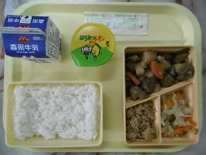 今日のメニューは、白ごはん、炒り鶏煮、野菜炒め、シーチキンのそぼろ煮、はちみつレモンゼリー、牛乳です。