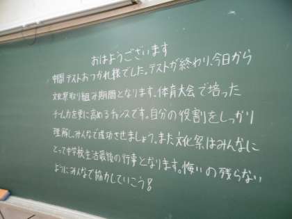 今朝、黒板に書かれていた担任の先生からのメッセージです。今日から11月1日(金)の文化祭に向けて取り組み時間を確保するために、45分授業になります。