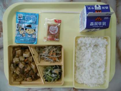 今日のメニューは、白ごはん、マーボードーフ、ごぼうサラダ、ごまドレッシング、チンゲン菜とえのきの和え物、ふりかけ、牛乳です。