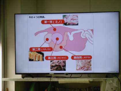 学習単元は「食品の特徴と調理上の性質」でした。牛にある4つの胃を映像で見て、生徒は興味津々でした。