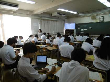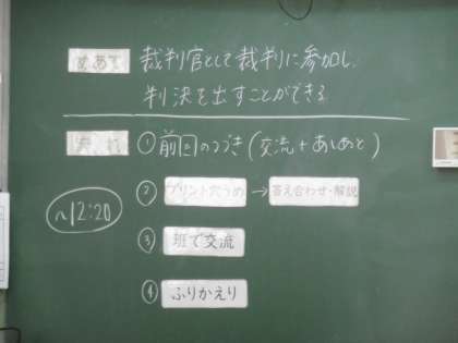 「裁判官として裁判に参加し、判決を出すことができる」が1時間の授業のめあてでした。興味のわくめあてに生徒は興味津々で、授業の進め方について真剣に話を聞いていました。