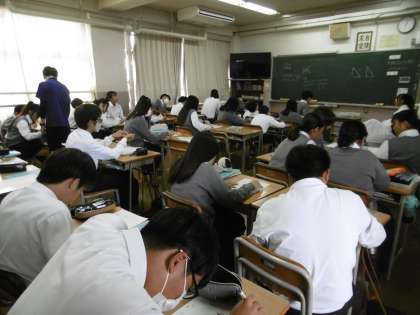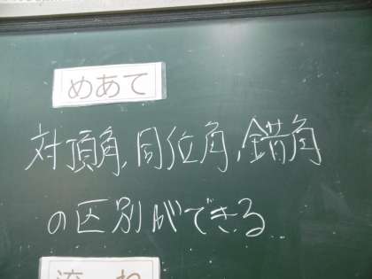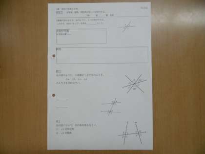 授業のめあては「対頂角、同位角、錯角の区別ができる」でした。子どもたちは一生懸命に学習プリントを解いていました。教科担当の先生も、生徒の質問に手際よく答えていました。