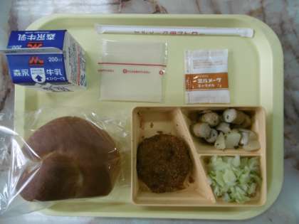 今日のメニューは、バーガーパン、ミンチカツ、ソーセージときのこのアヒージョ風、キャベツソテー、スライスチーズ、ミルメーク、牛乳です。