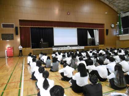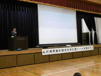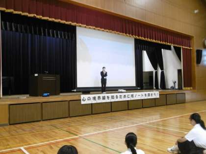 今日から後期の教育実習が始まっています。本校卒業の教育実習生(38期生)のあいさつのあと、校長が「心の境界線」について、生徒に話をしました。生徒会長からは先日行った生徒研修会で決まった後期生徒会のスローガンの紹介がありました。生徒会長の落ち着いた話しぶりにいつも感心します。