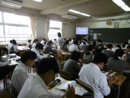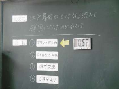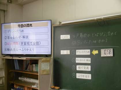 授業のめあては「江戸幕府がどのような流れで鎖国になったのかが分かる」でした。今日も授業のめあてや流れがきちんと黒板に示され、生徒にとって分かりやすい授業が行われていました。
