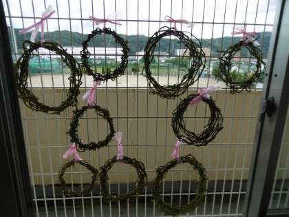 先日のイモ掘り体験で余ったイモの蔓(つる)を使って、クリスマスリース(作成中)が掲示されていました。クリスマスシーズンになれば、素敵な飾り物になっているはずです。今から楽しみです。