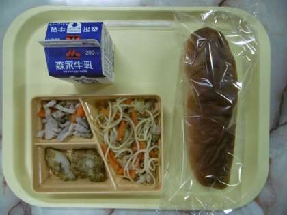 今日のメニューは、黒糖さつまいもパン、焼きスパゲティ、カレーチキン、れんこんの洋風きんぴら、牛乳です。
