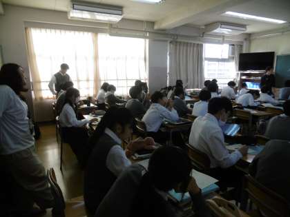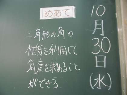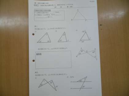 授業のめあては「三角形の角の性質を利用して、角度を求めることができる」でした。平行線のよさに気付いた生徒は、黙々と学習プリントの練習問題を解いていました。数学の授業で習う3つの分野(計算・関数・図形)の最後の単元を現在、学習しています。