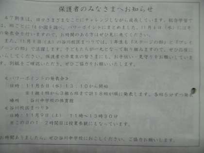 昨日、配付いたしました学年だより(unlimited〜無限大〜)にも掲載いたしましたが、総合的な学習の時間に取り組んだ多文化共生学習で、子どもたちは班ごとに18か国を調べ、パワーポイントにまとめました。その発表会を来週の6日(水)に行います。お時間のある方は是非、見に来てください。