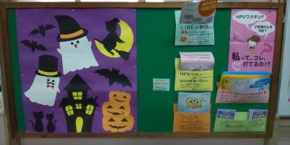先日、ハロウィンは終了しましたが、保健室前廊下の掲示物がハロウィン仕様になっていました。毎月、本校の養護教諭が工夫を凝らした掲示物を作成しています。健康に関するパンフレットなども用意されていました。