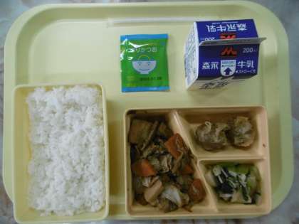 今日のメニューは、白ごはん、厚揚げとキャベツのみそ炒め、揚げシューマイ、チンゲン菜とえのきの和え物、ふりかけ、牛乳です。