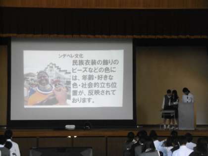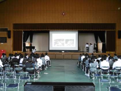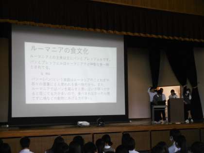 今日は各クラスで班ごとに調べた外国について、体育館で作成したパワーポイントを使って発表会を行いました。各班の発表も静かに聞くことができていました。さすが47期生です。今回学んだ多文化共生学習を通して、外国の文化に触れ、自分の視野や考え方、感じ方が広がっていくことを切に願っています。どの班の発表もとてもよかったです。