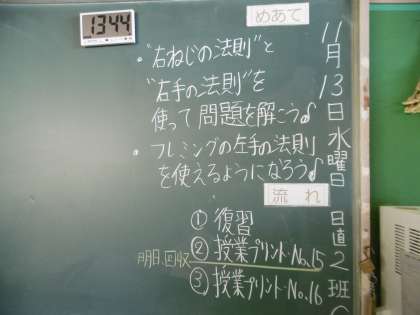 授業のめあては、「右ねじの法則と右手の法則を使って、問題を解こう。フレミングの左手の法則を使えるようになろう。」でした。動画を見てイメージを作ってから、問題を解くという授業スタイルでした。