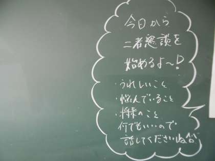写真は1年1組と3年2組です。1年生は今日から二者懇談がスタートします。先日取った「学校あんしんアンケート」をもとに、生徒と担任の先生が学校生活の悩みなどについて話をします。