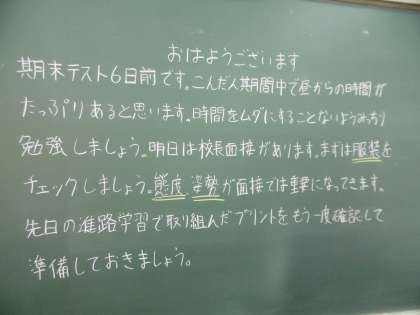 3年2組は明日の校長面接と来週行われる期末テストについて担任の先生からの熱いメッセージが今日も書かれていました。