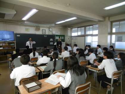 今日は大東市教育委員会より指導主事の先生や大東市内の中学校から英語科の先生が来校され、授業を見学していただきました。授業後には指導主事の先生から、授業内容やAET(英語実習助手)の活用について、指導助言をしていただきました。授業内容は現在進行形を表す〜ing形についてでした。
