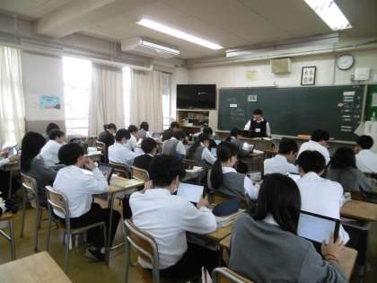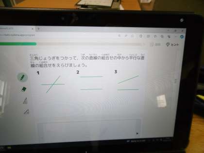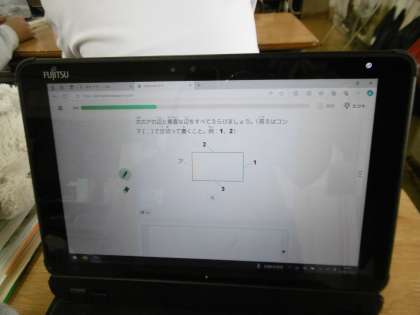 タブレットパソコンを使って、図形分野の復習を生徒はしていました。生徒にとってはクイズ形式で出される問題が取り掛かりやすいようです。