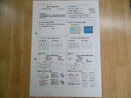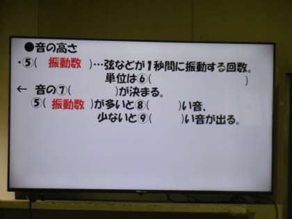授業のめあては「クラスのみんながモノコードで音の大きさや高さを変える方法を理解し、自分の力でまとめることができるようになる」でした。大型テレビに映し出された映像とカラーで作られた学習プリントが上手に活用されていました。