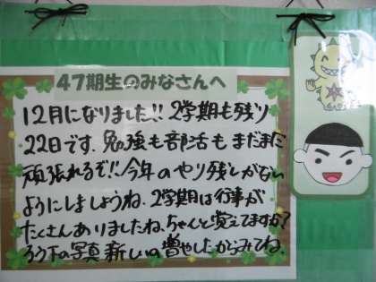 2学期も残すところ、登校日数は22日になりました。いい2学期の締めくくりができることを願っています。