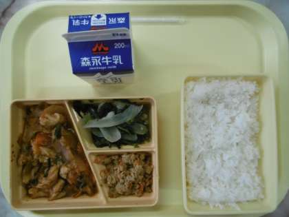 今日のメニューは、白ごはん、ダッカルビ、ベーコンとほうれん草の炒め物、ツナ大豆ふりかけ、牛乳です。