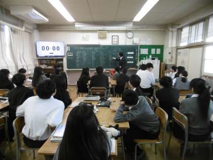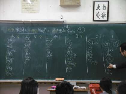 授業のめあては「規則動詞と不規則動詞の過去形の違いが分かる」でした。学習前に行った各班対抗による単語大会が大いに盛り上がっていました。