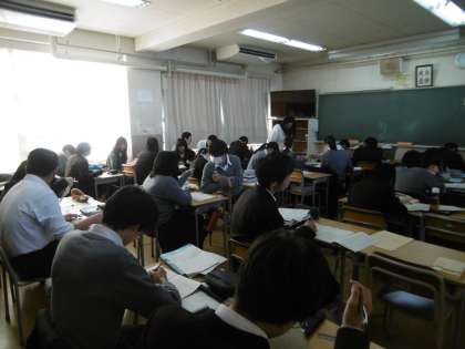 公立高校の入試問題をみんなで解いていました。3年間学校生活で積み上げた「学び合い、教え合い」が早速、行われていました。