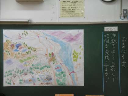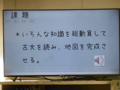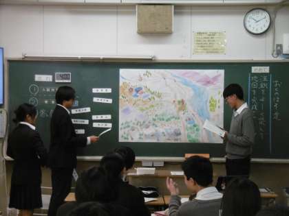 学習教材は「おくの細道」でした。授業のめあては「注釈をよく読んで、地図を完成させよう」でした。班で話し合いながら、おくの細道に出てくる和泉が城、金鶏山、衣が関、秀衛の跡、泰衛の旧跡の場所を地図上に表していました。生徒一人ひとりの思考力を高めるとてもいい授業でした。