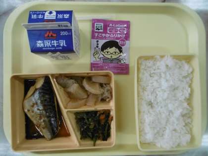 今日のメニューは、白ごはん、鯖の生姜煮、豚肉と大根の煮物、ほうれん草のごま和え、ふりかけ、牛乳です。