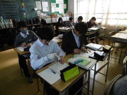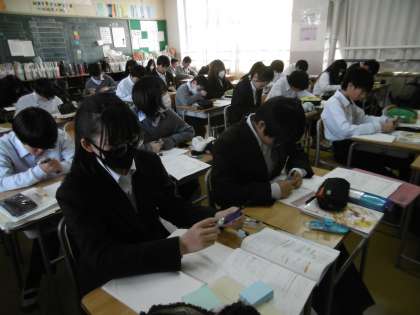 学習内容は「垂線の作図」でした。直線を引く定規と円を書くコンパスを使って、垂線(垂直な線分)を引いて、直角(90度)を作図していました。