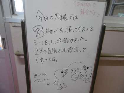 昨日行った昼休みの大縄跳びの練習を見て、1階廊下のホワイトボードにメッセージ書かれていました。大縄跳びの練習は、今日も続きます。