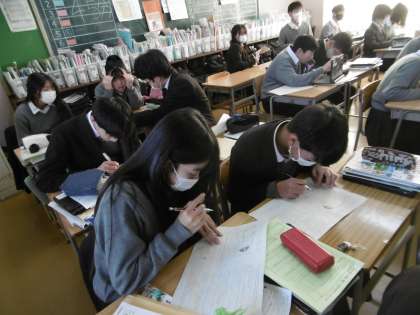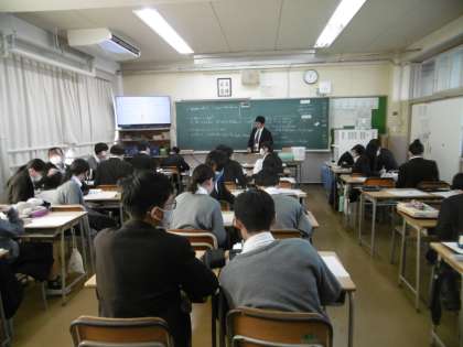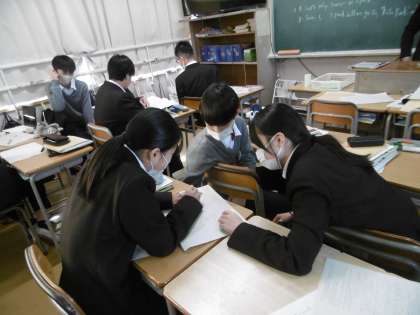 1月9日(木)に行われる大阪府チャレンジテスト対策プリントを集中して解いていました。家庭学習も継続は力なりです。今日も教え合い、学び合いの協同学習が繰り広げられていました。