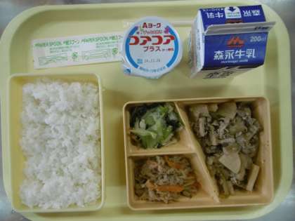今日のメニューは、豚丼、白ごはん、切干大根、チンゲン菜の炒め物、ヨーグルト、牛乳です。