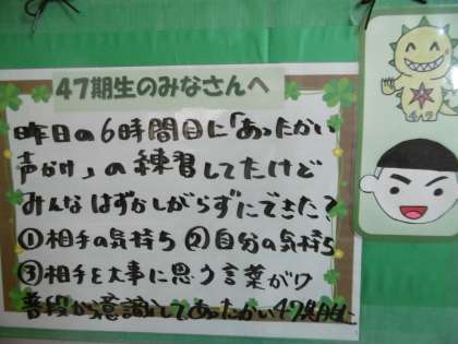 4階廊下に掲示されているメッセージボードです。現在、1年生(47期生)では、温かい学年づくりを行うために、SST(ソーシャルスキルトレーニング)を学習しています。SSTでは、円滑なコミュニケーションや対人関係を築くのに必要なコミュニケーション力を高める方法を学びます。