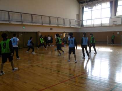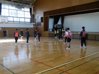 男子も体育館で「ミニサッカー」をしていました。元気のある学年(46期生)らしく、授業も大盛り上がりでした。