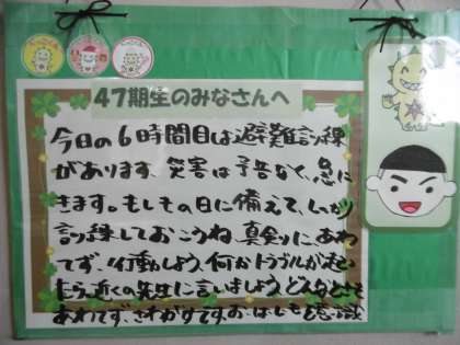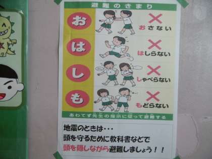 4階廊下に掲示されていました。今日の避難訓練(地震を想定)に向けて、掲示物(お・は・し・も)を作成してくれていました。