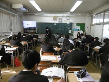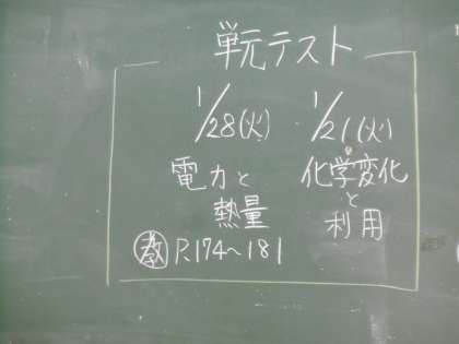 単元テストの予告が行われていました。2年1組の単元テストは、1月21日(火)「電力と熱量」、1月28日(火)「化学変化と利用」になります。しっかりテストまでに復習をしておきましょう。