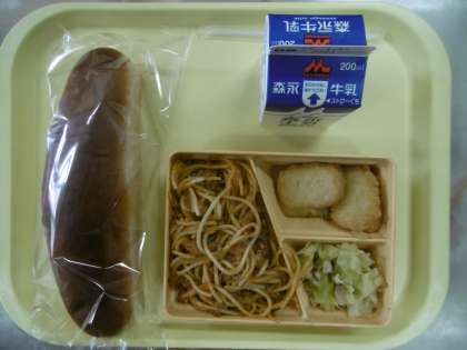 今日のメニューは、黒糖パン、スパゲティミートソース、チキンナゲット、キャベツとハムのサラダ、牛乳です。