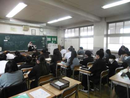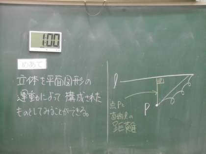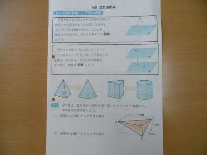 学習内容は「空間図形」でした。分かりやすく作成された学習プリントを使って、点と点、点と直線、直線と平面の距離についての考え方と説明が行われていました。