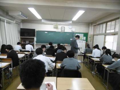 先週行われた卒業テストの返却が行われていました。テストは終わってからが(も)大事です。写真は上から、3年1組(社会)、3年2組(英語)、3年3組(理科)です。