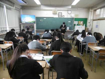 授業のめあては「オセアニアと他地域の結びつきの変化が分かる」でした。写真は授業の始めに学習プリントの空欄をまずは自分で調べ(個人思考)、記入しているところです。子どもたちは集中して課題に取り組んでいました。