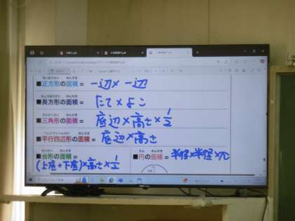 授業のめあては「角錐、角柱、円錐、円柱の表面積を求めることができる」でした。合わせて、円、三角形、長方形、平行四辺形、台形、ひし形の面積を求める公式も紹介されていました。