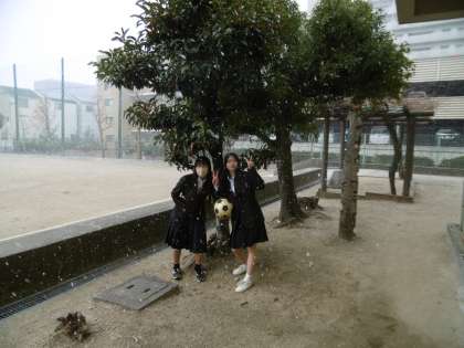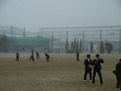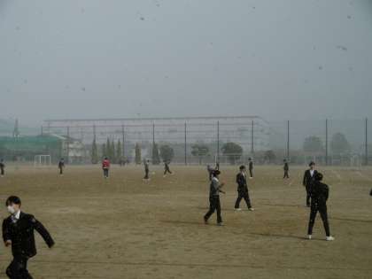 昼休みのグラウンドの様子です。雪が降る中、先生も生徒と一緒に遊んでいました。子どもにとっては、やはり雪は楽しいもののようです。