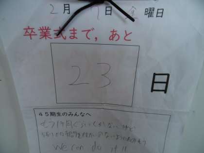 3年生(45期生)は、卒業式まであと登校日数が23日になりました。いよいよ10日(月)は、私立高校等の入試です。体調管理にも気をつけながら、自分が努力してきたことに自信をもって、当日の入試に臨みましょう。