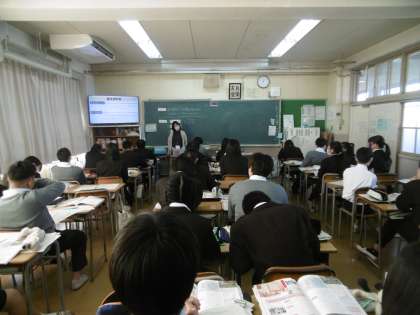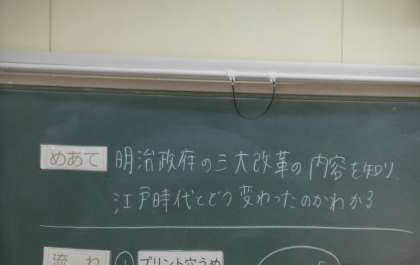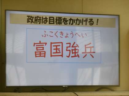授業のめあては「明治政府の三大改革の内容を知り、江戸時代とどう変わったのか分かる」でした。教科担当の先生が「富国強兵」の言葉の意味を生徒に尋ねていると、様々な答えが返ってきました。