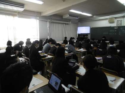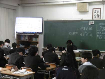 配付された学習プリントをもとに、授業が進められていました。2年生(46期生)は、2月10日(月)に行われる実力テストを模擬入試と位置づけて、出願→受験→合格発表の流れで生徒はテストを受けることになっています。