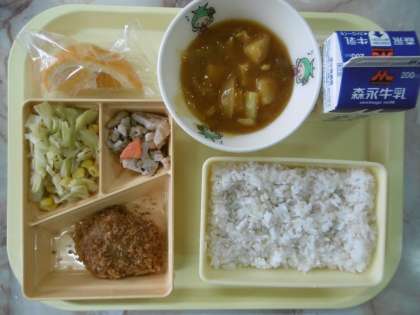 今日のメニューは、もち麦ごはん、豚かつ、キャベツとコーンのサラダ、れんこんの洋風きんぴら、いよかん、チキンカレー、牛乳です。