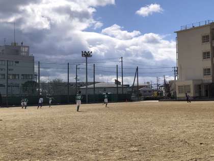 今日は深野中学校で、谷川中学校と深野中学校の合同チーム、南郷中学校と住道中学校の合同チーム、諸福中学校の大東市の3中学校で練習試合を行いました。実力テスト前でしたが、寒い中、体を動かして楽しんでいました。